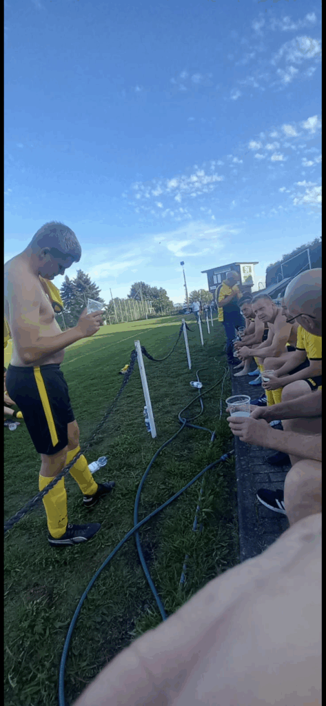 Nach den dürftigen Auftritten der letzten Wochen gab es einige Umstellungen. Lehmi und Felix rückten in die Defensive. Kapitän Böttcher wurde, aufgrund seiner Wucht und Kopfballstärke in den Sturm beordert. Dies sollte sich positiv auswirken. Wieder konnte Timo zum 1:0 einnetzen, krasse Quote bisher von ihm… danach dezimierten sich die Gastgeber nach Tätlichkeit. Klasse Kopfball-Tore von Böttcher folgten, inklusive sehenswerten Tor per Außenfrist.