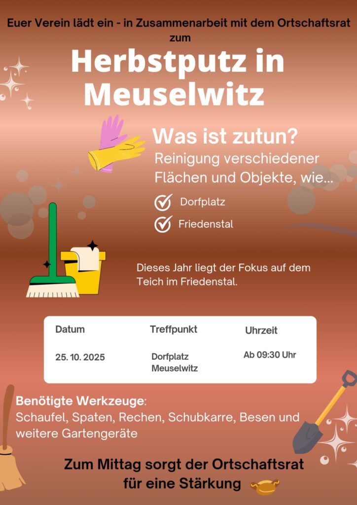 Der Verein „Lebenswert e.V.“ hat für das kommende Wochenende (25./26.10) zwei Events organisiert. Am Samstag gibt’s einen Herbstputz mit dem Schwerpunkt „Friedenstal“. 09:30 Uhr geht’s los.